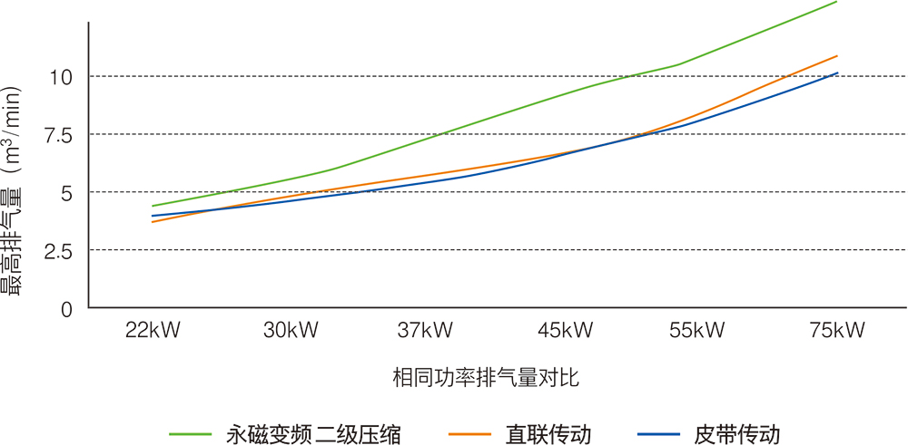 采用第三代全新研發JAGUAR型線,由臺灣團隊長達數年開發,提供行業領先水平的排氣量。超大排氣量主機,同比相同功率空壓機,排氣量遠大一檔,充沛磅礴的排氣量,為您的工業生產提供充足的壓縮空氣。舉例說明:二級壓縮90kW空壓機可輕易替換普通110kW空壓機。